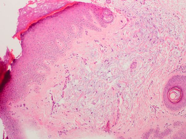 Resim 1 Bilateral el dorsumunda ve önkollarda simetrik olarak yerleşmiş, 2–5 mm çaplı, deri renginde, kubbemsi çok sayıda papülResim 2 Dermal kollagen demetler arasında bazofilik görünümlü musinöz dejenerasyon alanları, Hematoksilen+Eozin, orijinal büyütme X10
