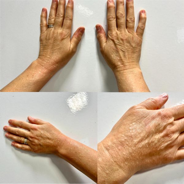 56 yaşında kadın hasta, yaklaşık 4 yıldır her iki el sırtı ve distal önkollarında mevcut olan, asemptomatik, simetrik yerleşimli deri lezyonları ile başvurdu. Lezyonlar zamanla sayıca artmış, ancak travma, sistemik belirti ya da ilaç kullanımı ile ilişkili olmamıştır. Ailede benzer öykü bulunmamaktadır.