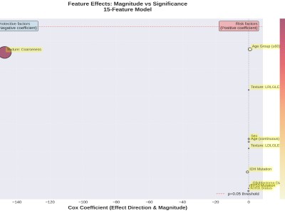 An Extra Survival Trees model with 15 features achieved the highest test C-index (0.731), closely followed by an elastic-net Cox with ten features (0.730). Original NGTDM Coarseness consistently emerged as a dominant radiomic predictor alongside glioblastoma histology, age and IDH status. Feature sets of 10–15 variables offered the best balance between discrimination and generalisability. Mutual-information selection in the glioblastoma cohort yielded C-index 0.65. A Cox model demonstrated independent test discrimination (C-index 0.64; 95% CI 0.52–0.75), significant risk stratification (p < 0.05) and 71.8% accuracy for 24-month survival classification.
